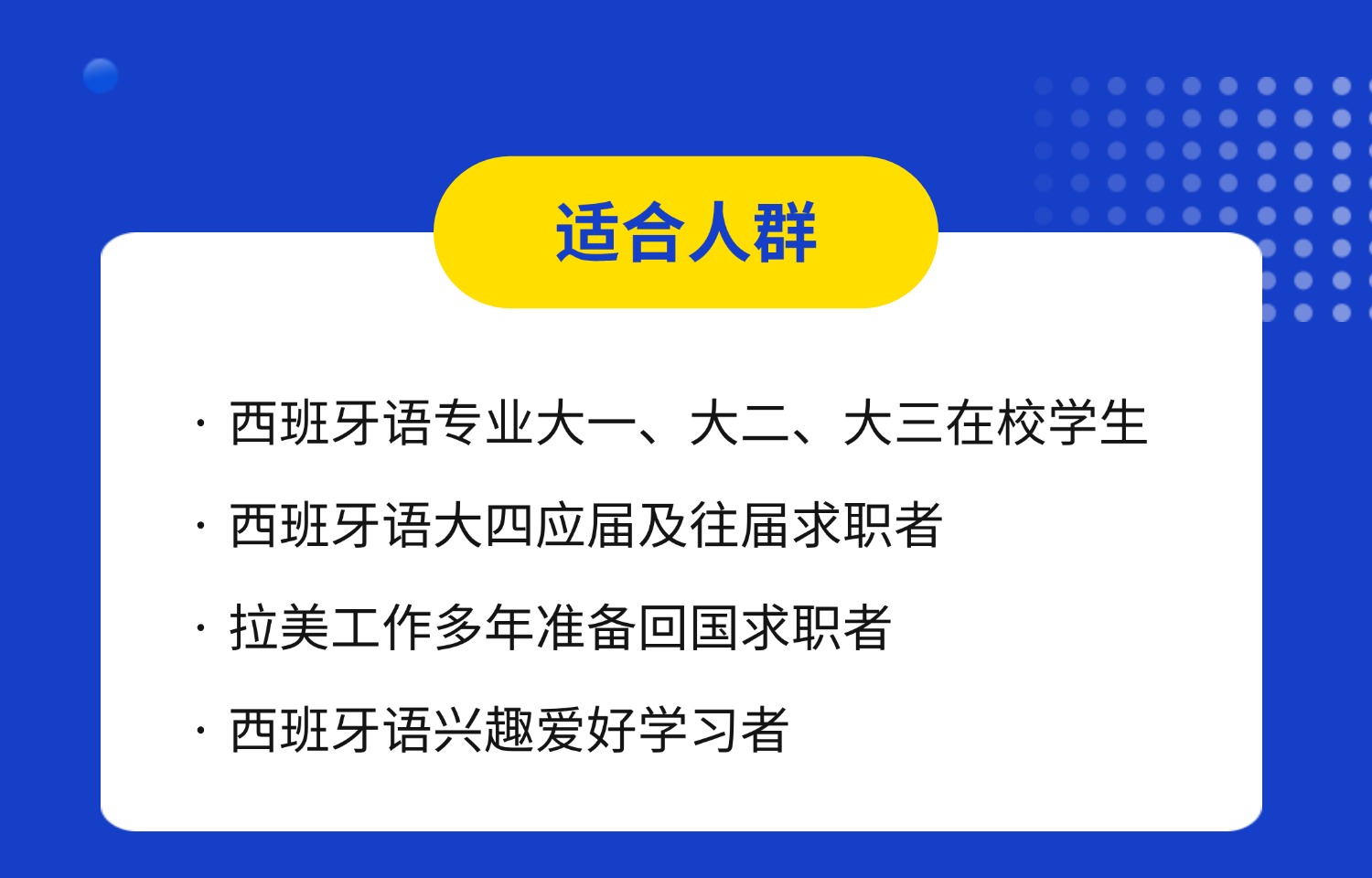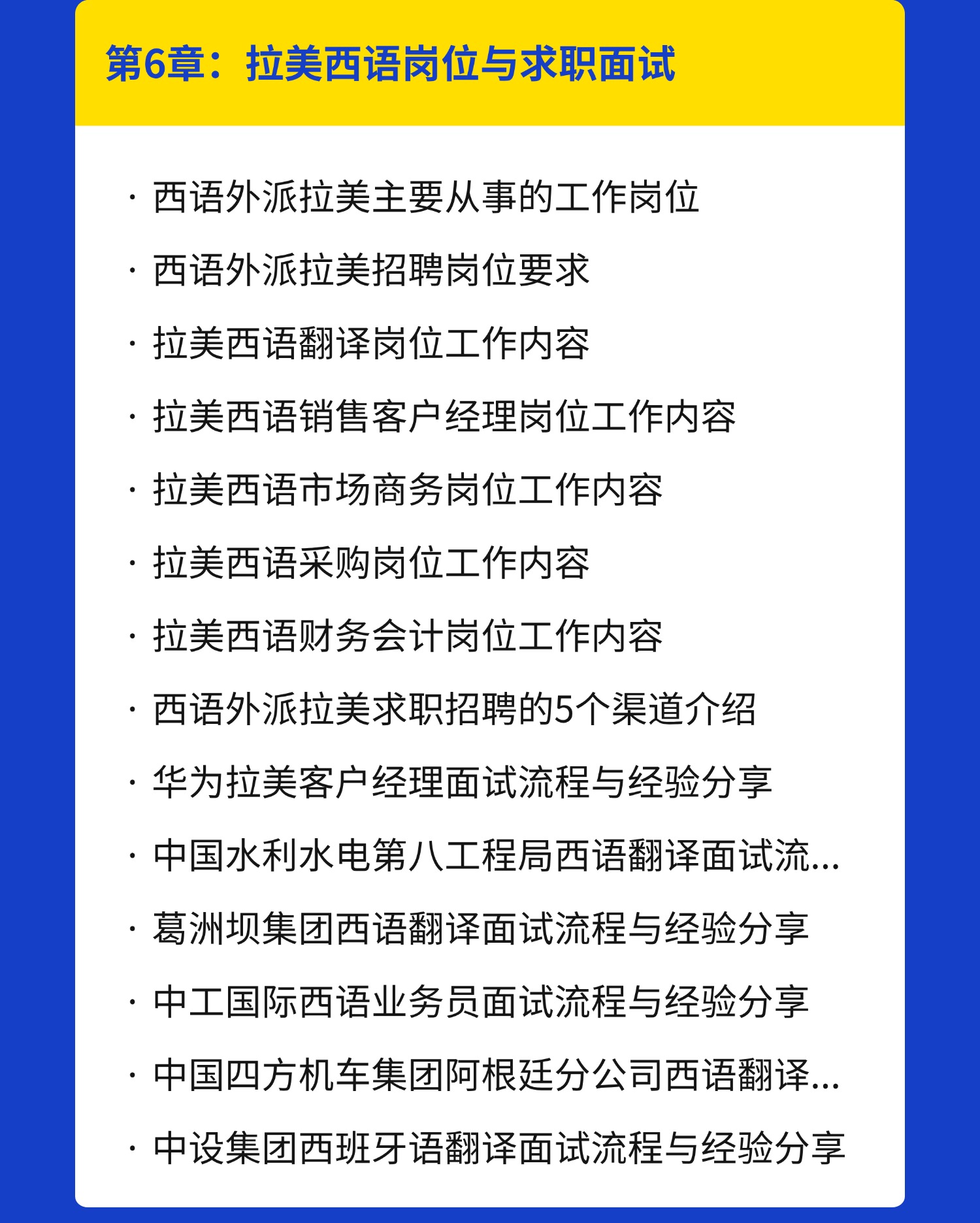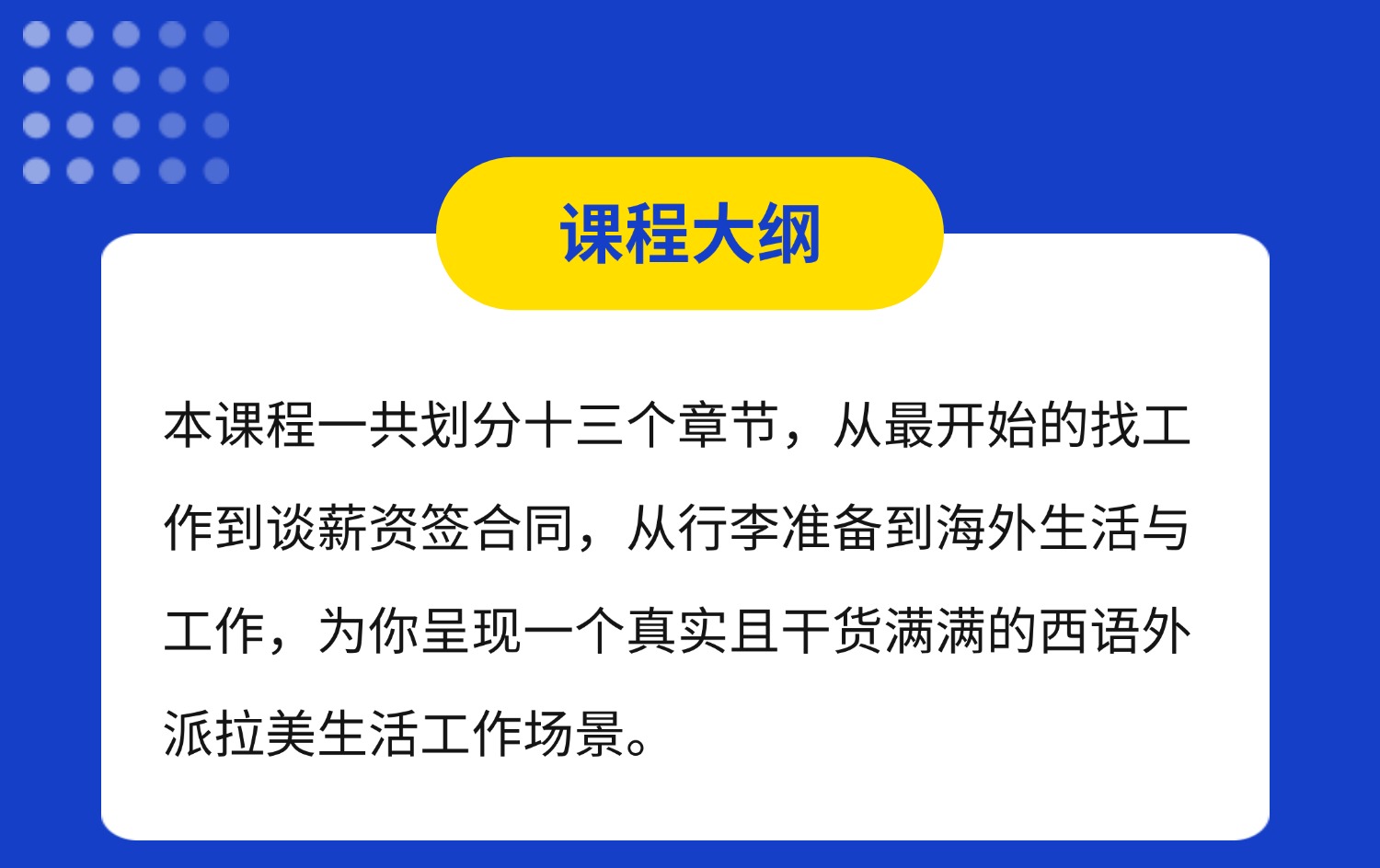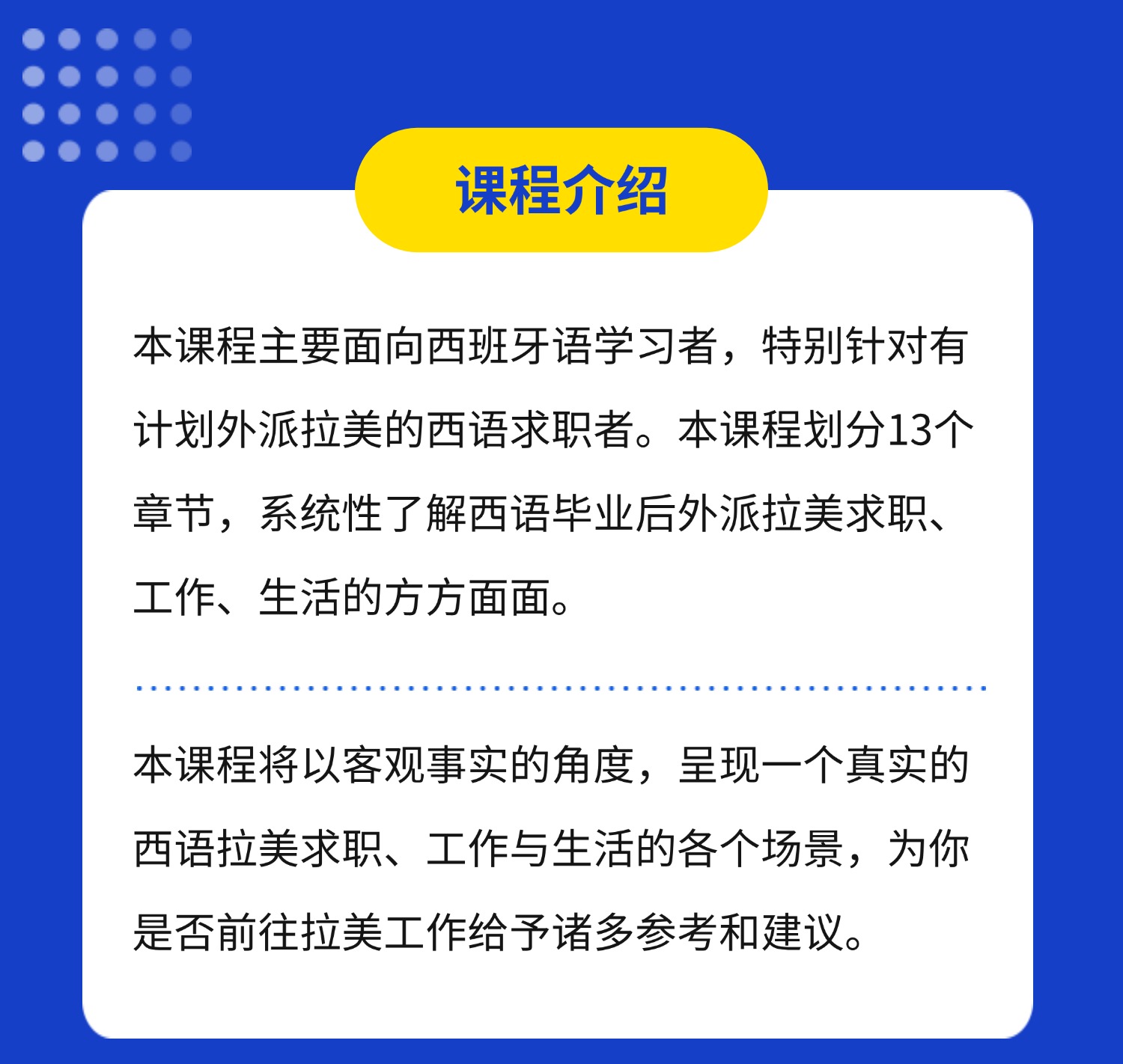 西班牙语专业外派拉美「求职·工作·生活」指南课程 课程 求职课程 · 西语外派拉美 学习课程 课程目录 购买须知 内容查看此内容仅限永久课程VIP查看,请先登录 内容查看永久课程VIP专享仅限永久课程VIP查看立即升级版权声明:课程内容已申请TSA可信时间戳数字版权保护,版权均属于外语派所有。 该课程适合小语种专业在校生及求职者 该课程为付费系列课程,一经购买,可随时学习 该课程听课权益跟随支付购买账号ID,不支持更换 该课程为虚拟内容服务,购买成功后无法退款,敬请谅解 课程内容已申请TSA可信时间戳数字版权保护,版权均属于外语派所有,未经授权,任单位及个人不得转载、摘编或使用本课程内容,否则,外语派有权追究其法律责任。