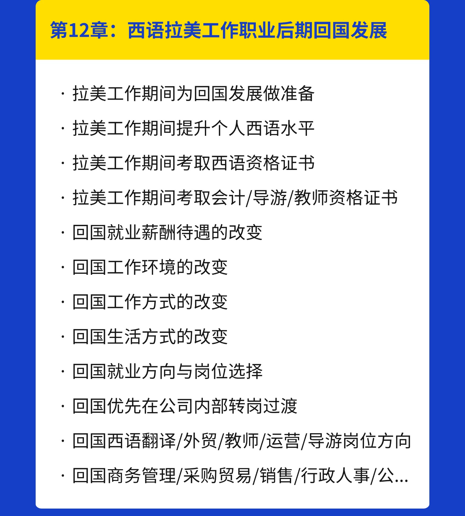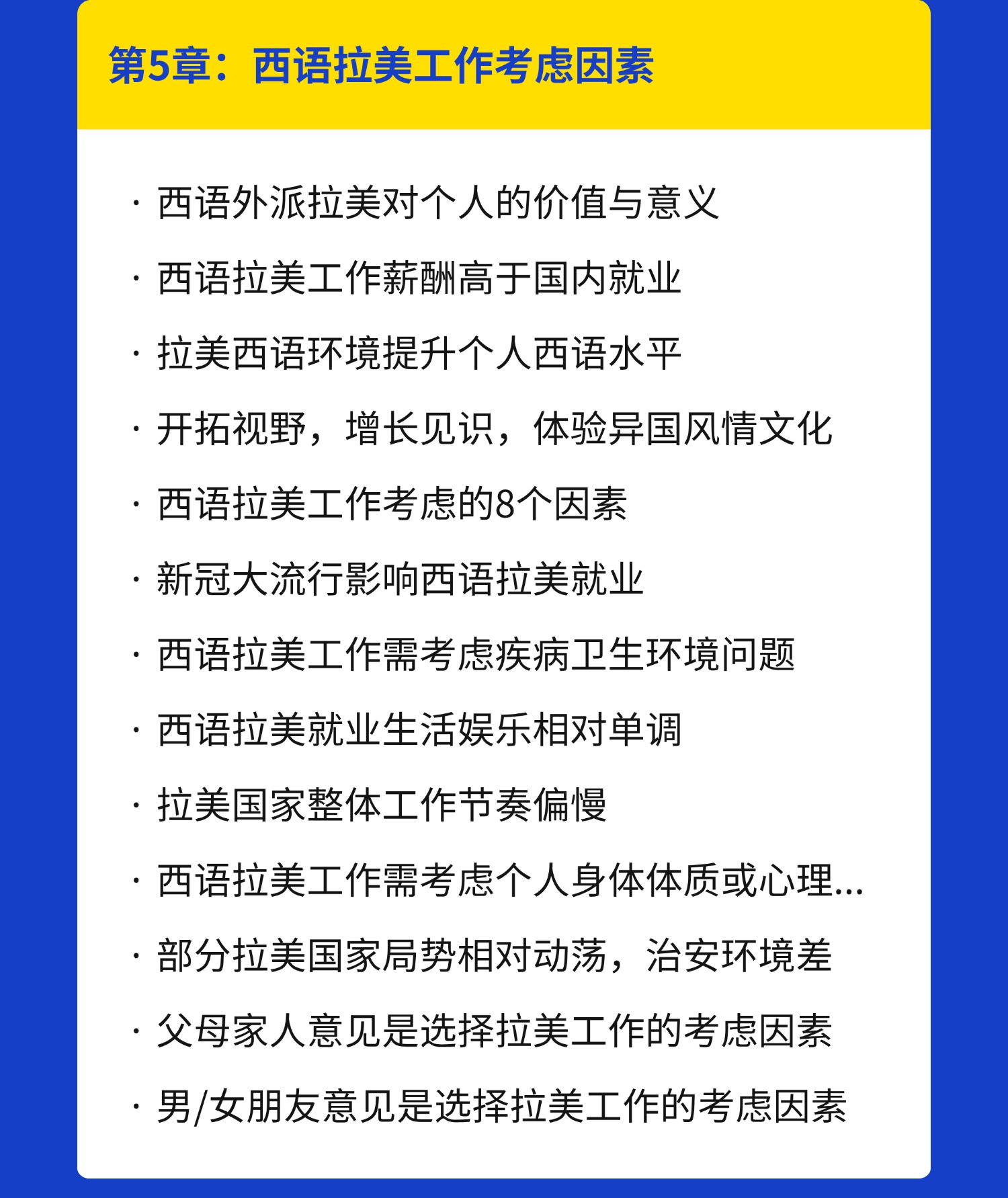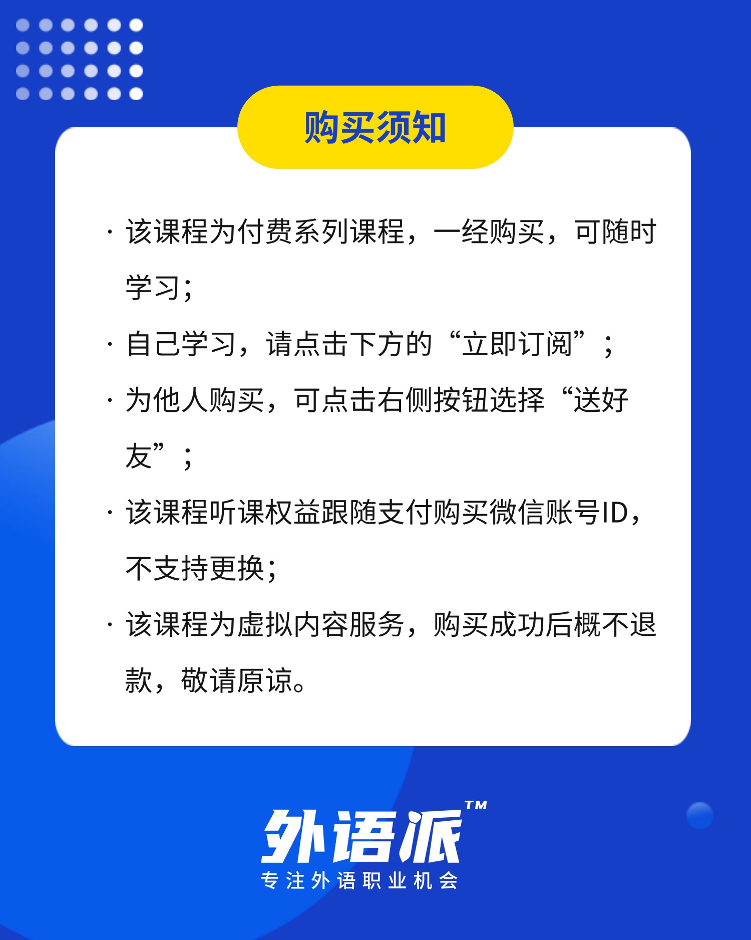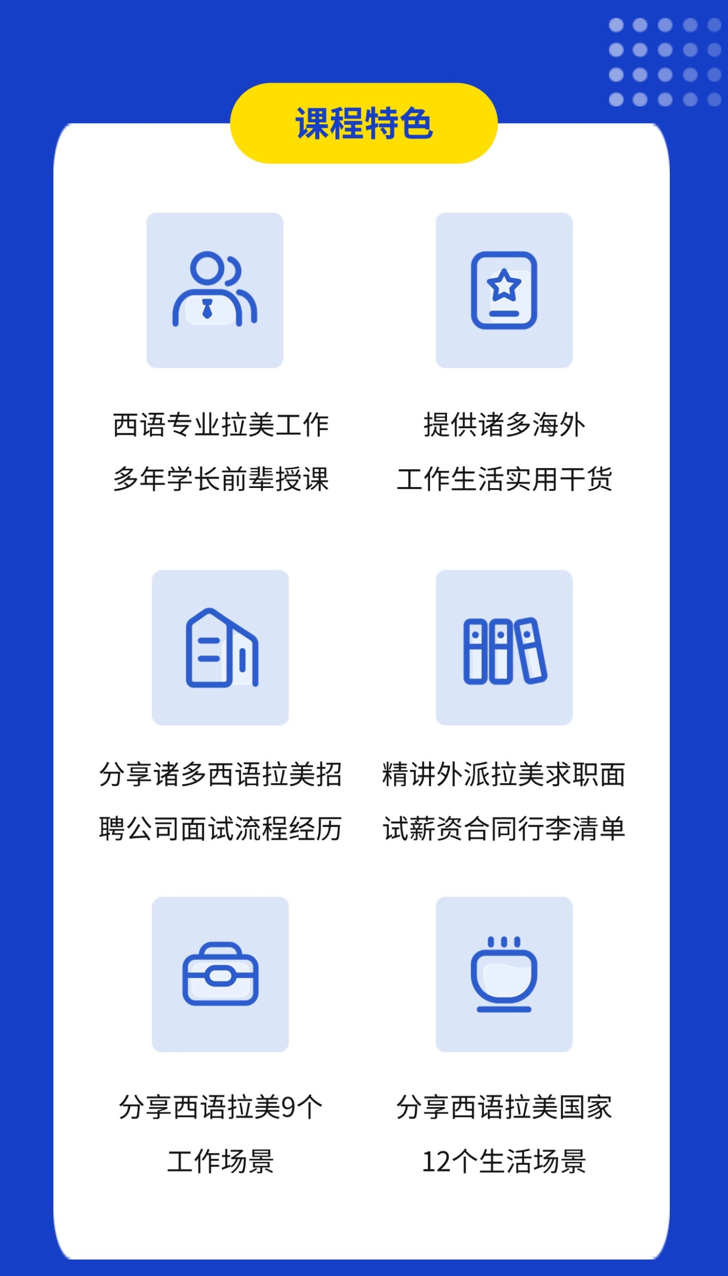 西班牙语专业外派拉美「求职·工作·生活」指南课程 课程 求职课程 · 西语外派拉美 学习课程 课程目录 购买须知 内容查看此内容仅限永久课程VIP查看,请先登录 内容查看永久课程VIP专享仅限永久课程VIP查看立即升级版权声明:课程内容已申请TSA可信时间戳数字版权保护,版权均属于外语派所有。 该课程适合小语种专业在校生及求职者 该课程为付费系列课程,一经购买,可随时学习 该课程听课权益跟随支付购买账号ID,不支持更换 该课程为虚拟内容服务,购买成功后无法退款,敬请谅解 课程内容已申请TSA可信时间戳数字版权保护,版权均属于外语派所有,未经授权,任单位及个人不得转载、摘编或使用本课程内容,否则,外语派有权追究其法律责任。